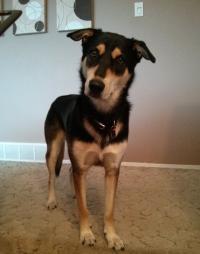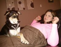 Our dog Meisha is a little over eighteen months old now and always waits to greet Tressa home from work as seen in the first picture. The second picture is funny because Meisha knows that she is not allowed to go on the couch, but gets around the issue by going on us from time to time. She also has crossed her paws which looks very pseudo ladylike.